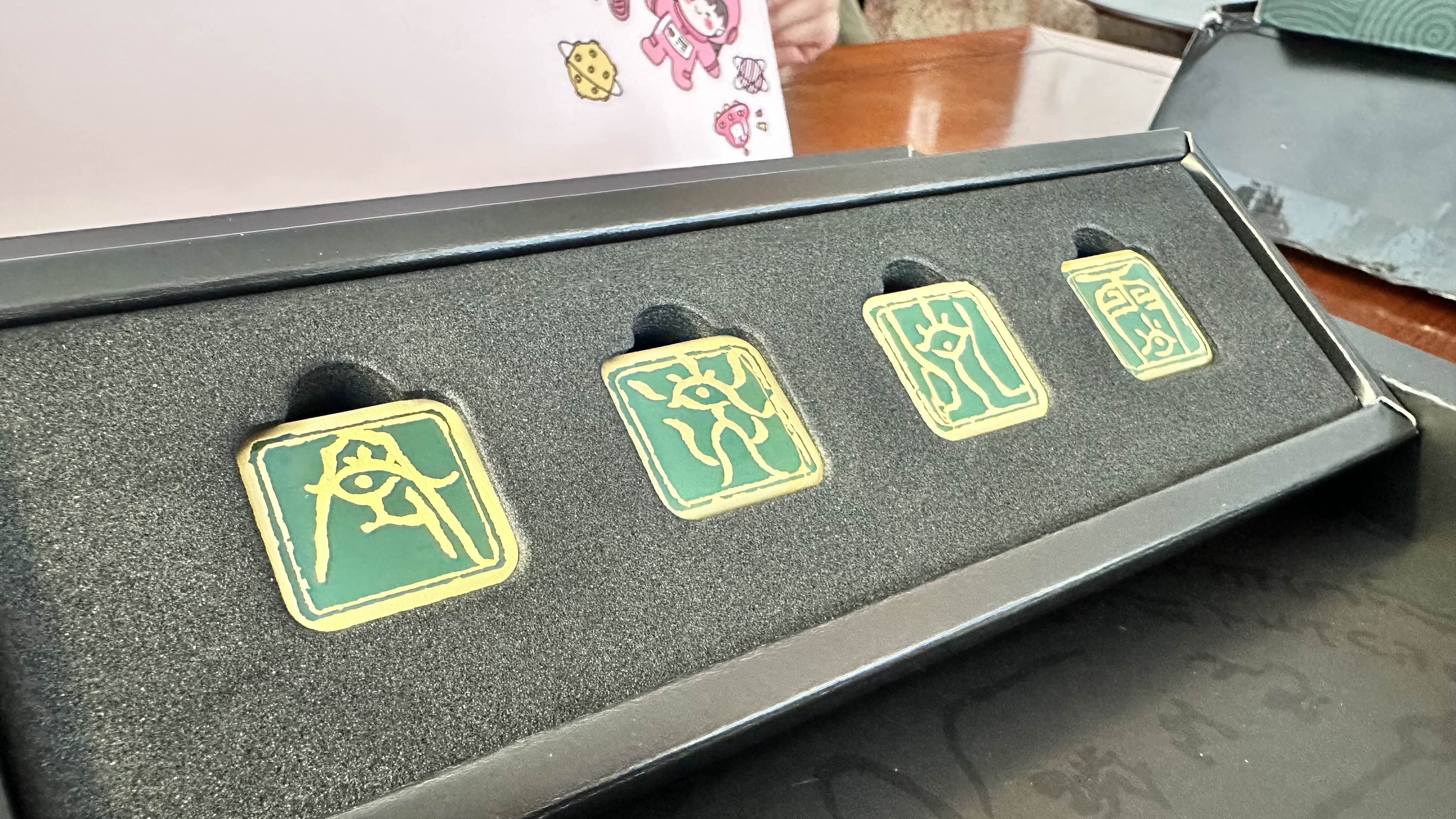 아직 뭔지 모르는 문양의 배지 4개,